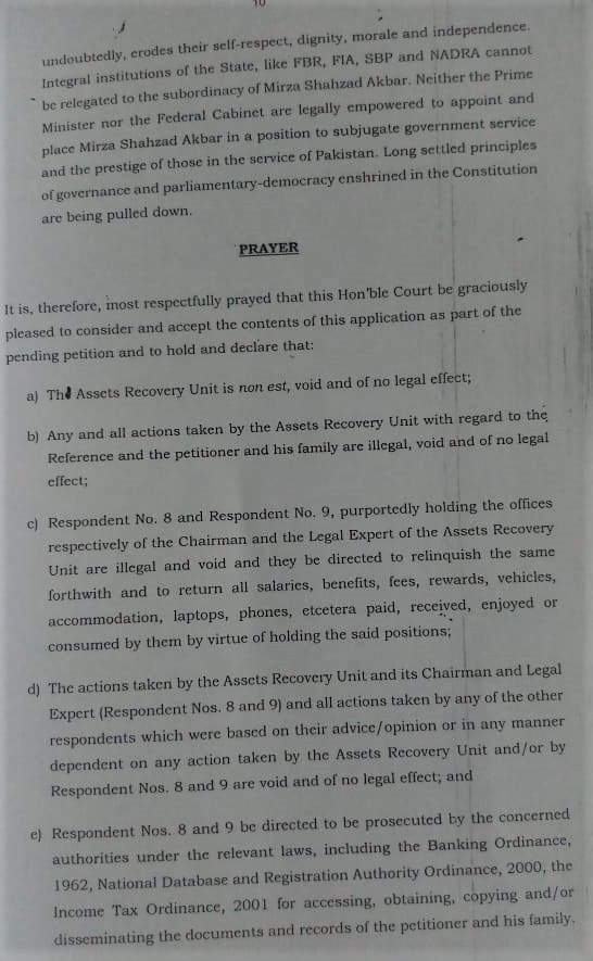 جسٹس فائز عیسی کے مطابق ایسٹ ریکوری یونٹ اور اس کا چیئرمین دونوں غیر قانونی طریقے سے بنائے گئے لہذا درخواست میں کہا گیا ہے کہ یونٹ کے سربراہ شہزاد اکبر اور قانونی ماہر ضیا المطفی کے خلاف بینکنگ آرڈیننس اور متعلقہ قوانین کے مطابق کاروائی کی جائے اور ان سے نتخواہ سمیت تمام مراعات واپس لی جائیں۔