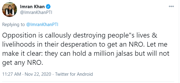 پاکستان کے وزیراعظم عمران خان کا کہنا ہے کہ حکومت مخالف اتحاد پاکستان ڈیموکریٹک موومنٹ صرف این آر او کے لیے اپنے جلسوں سے عوام کی زندگیوں کو خطرے میں ڈال رہی ہے۔