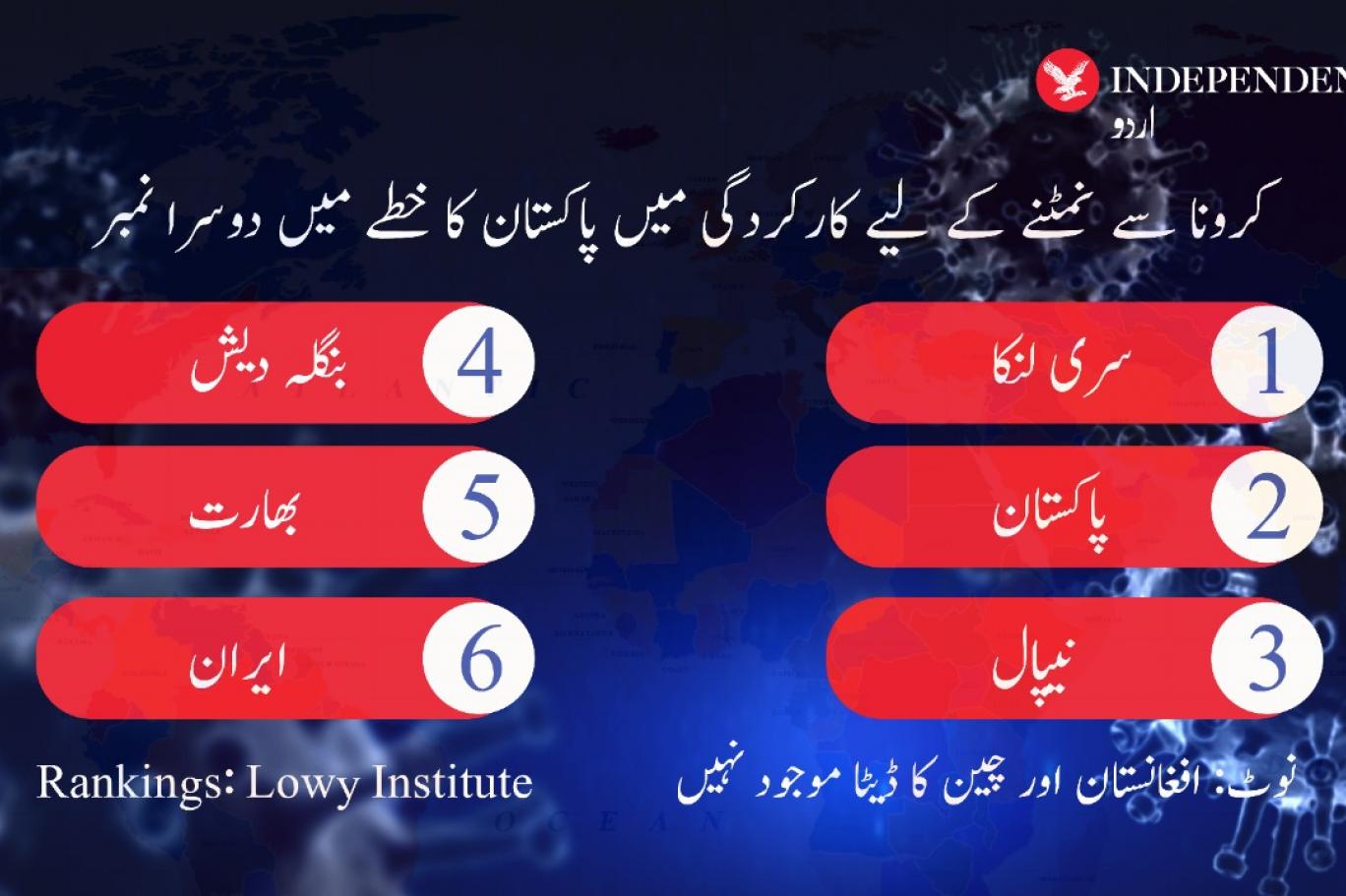 کرونا (کورونا) وائرس سے پھیلنے والی بیماری کووڈ 19 پر قابو پانے کے لیے 100 ملکوں کی مختلف حکمت عملی اپنانے اور ان کے نتائج پر سامنے آنے والی ایک حالیہ رینکنگ کے مطابق پاکستان 69 ویں اور بھارت 86 ویں نمبر پر آیا ہے۔