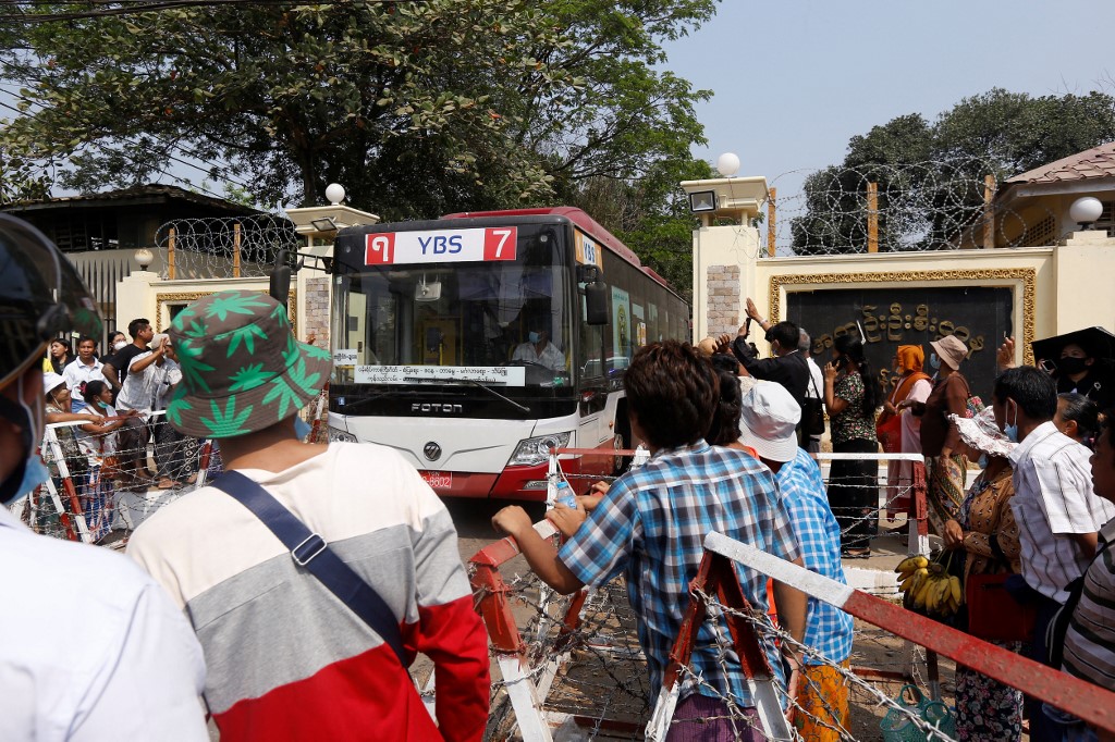 ینگون کی آنسین جیل سے رہا کیے گئے سینکڑوں افراد میں زیادہ تعداد نوجوانوں کی تھی، جن میں سے کچھ احتجاجی تحریک کے دوران اختیار کیے جانے والے تین انگلیوں کے اشارے سے اپنی خوشی کا اظہار کرتے نظر آرہے تھے۔