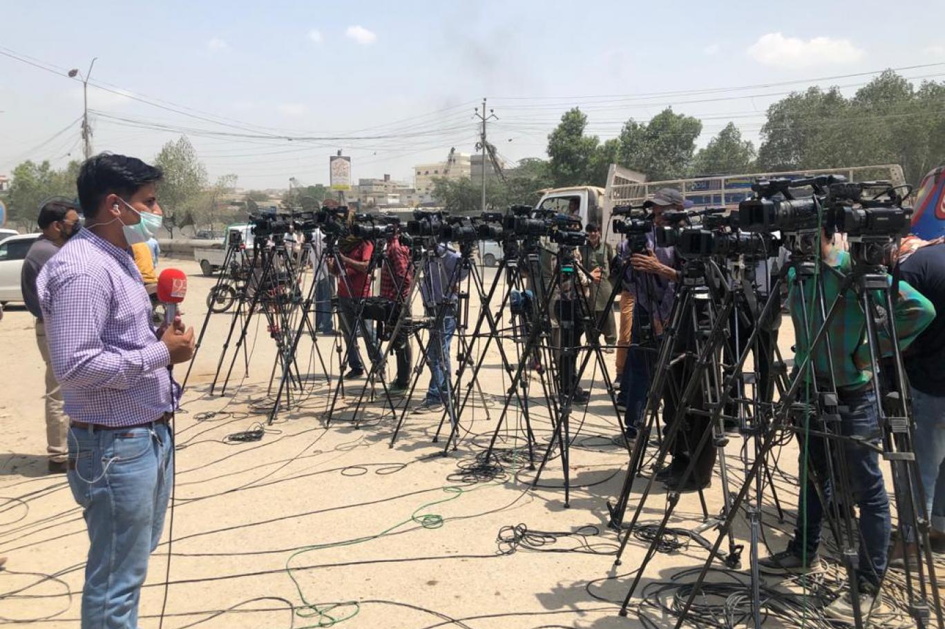 کراچی کی شدید گرمی کے باعث عمارت کے مرکزی دروازے کے باہر ایک قطار میں موجود مقامی میڈیا کے کیمرامینوں کی حالت ابتر دکھائی دی۔