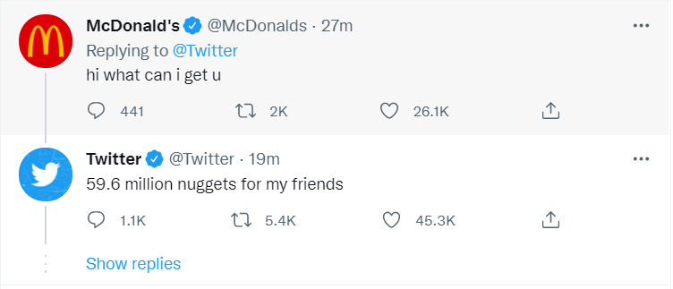اسی ٹویٹ پر میکڈونلڈ کے آفیشل اکاؤنٹ سے ٹویٹ کیا گیا ’ہائے، میں آپ کے لیے کیا کر سکتا ہوں۔‘ بنیادی طور پہ یہ وہ لہجہ ہے جس میں میکڈونلڈ کا سٹاف آپ سے آرڈر لیتا ہے۔