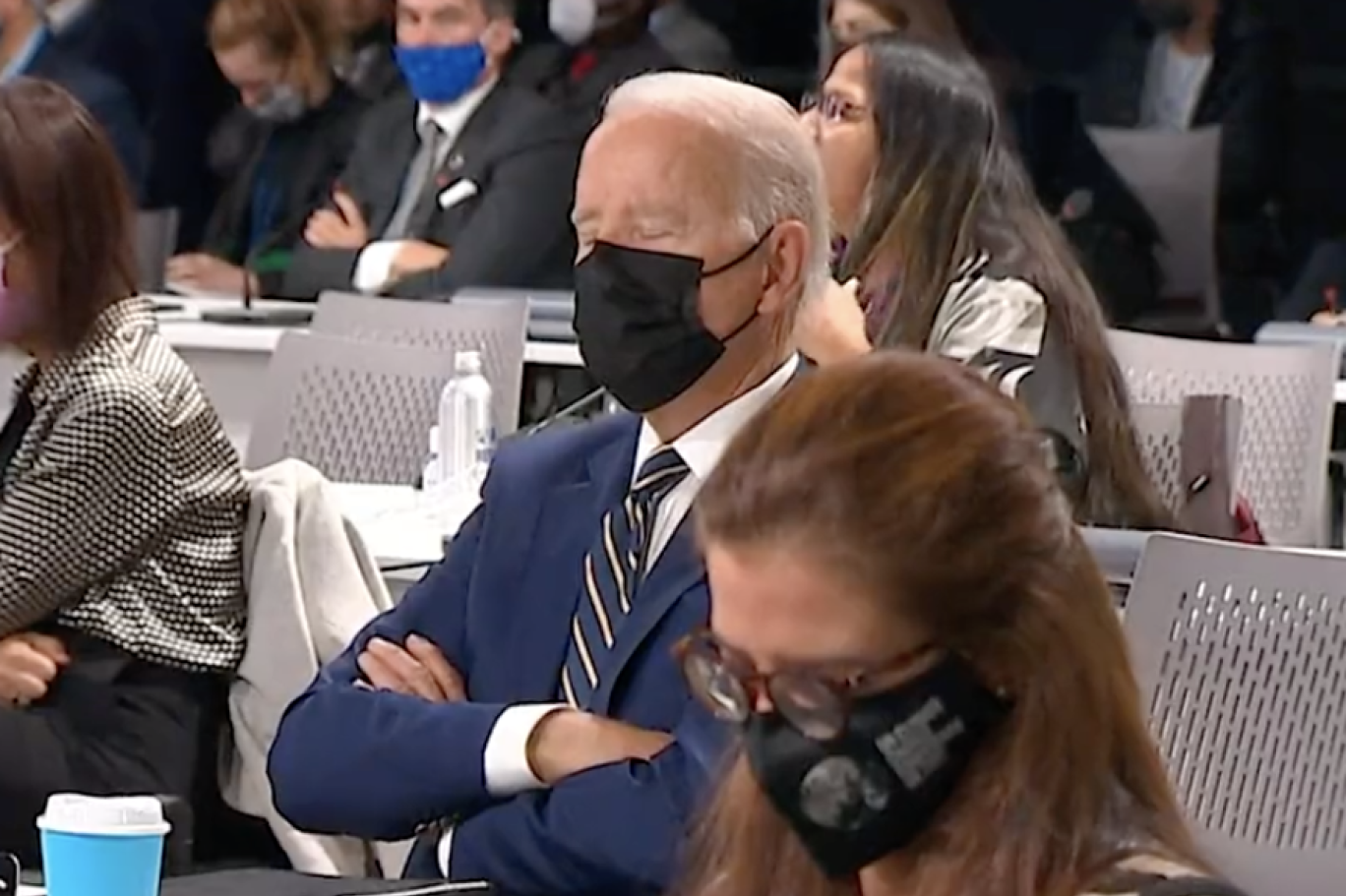 Joe Biden falls asleep for more than 30 seconds during the opening remarks of the COP26 Climate Summit, is woken up by a staffer, and then applauds as if he was listening to the speech the entire time. Exceeding expectations. #COP26 #ClimateJusticeNow pic.twitter.com/0Z7pOjK9kL