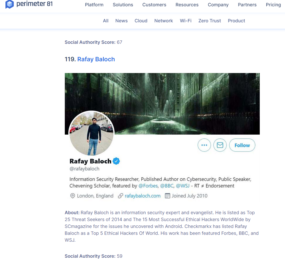 گوگل اور اینڈارئڈ میں خامیاں تلاش کرنے پر 28 سالہ رافع بلوچ نے دنیا بھر میں بطور سائبر سکیورٹی ماہر اور ایتھکل ہیکر شہرت حاصل کی، جس کے بعد انہیں دنیا کے سائبر سکیورٹی کے نامور جریدوں نے اعلیٰ سائبر ماہرین کی فہرستوں میں مختلف موقعوں پر شامل کیا۔