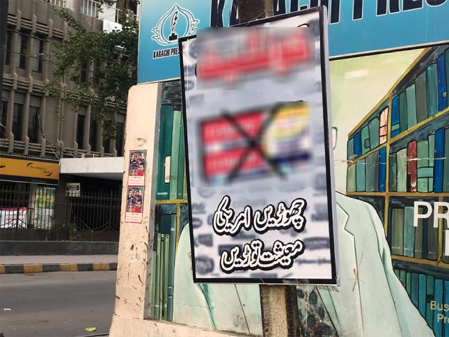 پاکستان اسرائیل، امریکی مصنوعات کے بائیکاٹ کے لیے ’پراسرار‘ بینرز ان بینرز پر امریکہ اور دیگر عالمی کمپنیوں کے لوگو پر کالے رنگ سے کراس (X) کا نشان اور سرخ رنگ سے بائیکاٹ کے نشان لگا کر عوام الناس سے اپیل کی گئی ہے کہ وہ ان کمپنیوں کی مصنوعات کا مکمل بائیکاٹ کریں۔