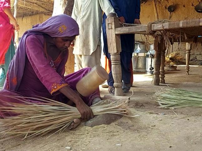 خواتین گھرواری کی خواتین کے ہاتھوں بان کی رسی کا ہنر اب بھی زندہ سندھ کے ضلع جام شورو میں واقع گھرواری گاؤں کی خواتین کھجور کی بجائے 'پیش' کے درخت کی شاخوں سے بان کی رسی بناتے اپنا پورا دن گزار دیتی ہیں، تب کہیں جا کر چار پیسے ہاتھ آتے ہیں۔