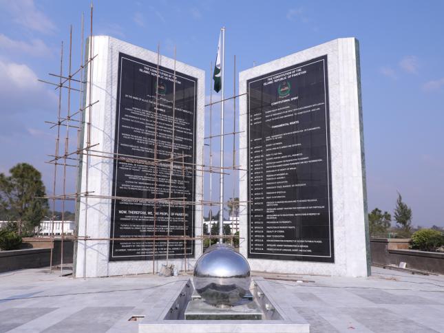 تاریخ یادگار دستور تو بن گئی لیکن آئین کا دفاع کس کی ذمہ داری؟ سات سیڑھیاں آئین کے سات شیڈول کی نشاندہی کرتی ہیں جبکہ دو سو ستتر لائٹس اس کی دو سو ستتر دفعات کی عکاسی کرتی ہیں۔ چار پلانٹرز چاروں صوبوں کی نمائندگی کرتے ہیں۔