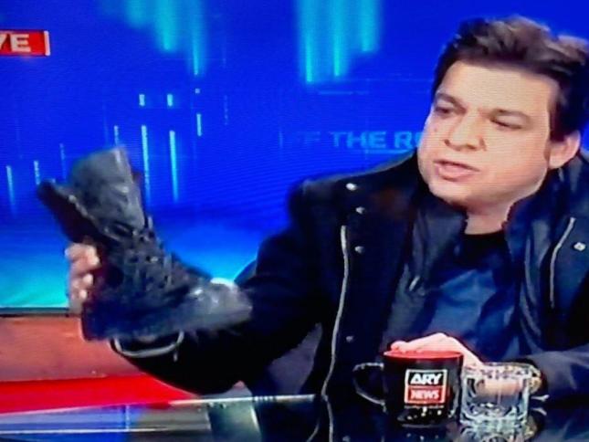 ٹرینڈنگ لائیو ٹی وی شو میں فیصل واوڈا کے ’بوٹ‘ پر تنقید اے آر وائی نیوز کے پروگرام ’آف دی ریکارڈ‘ میں شرکت کے دوران وفاقی وزیر فیصل واوڈا نے ایک بوٹ اٹھا کر میز پر رکھ دیا اور کہا: ’میں ہر پروگرام میں یہ سامنے رکھا کروں گا۔‘