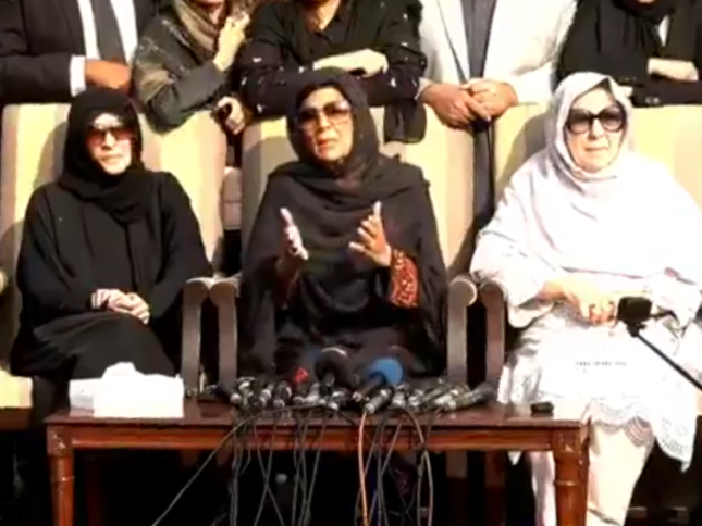 علیمہ خان، عظمیٰ خان اور  پی ٹی آئی کی دیگر خواتین رہنماؤں نے اسلام آباد میں پریس کانفرنس کے دوران پولیس رویے، خواتین کارکنوں پر مبینہ تشدد اور بانی پی ٹی آئی کی مبینہ قیدِ تنہائی پر سخت تحفظات کا اظہار کیا۔