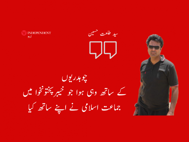 زاویہ سید طلعت حسین اس طرح تو ہوتا ہے چوہدریوں کے کاموں میں چوہدریوں کے ساتھ وہی کچھ ہوا جو خیبرپختونخوا میں جماعت اسلامی نے اپنے ساتھ کیا۔ صنم بھی بھاگ گیا اور وقار بھی۔