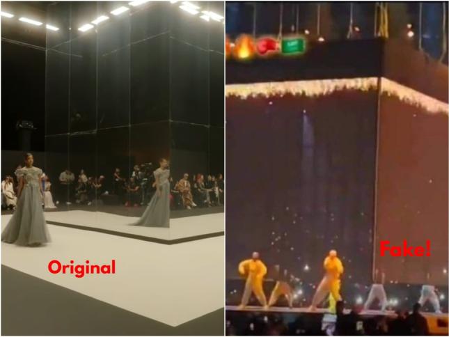 سوشل میڈیا پر گردش کرنے والی کعبہ کے سامنے فیشن شو اور بت رکھے جانے کی ویڈیو دراصل فیک یعنی جعلی ہے جسے دو ویڈیو جوڑ کر یہ تاثر دیا گیا ہے کہ کعبہ کے ماڈل کے سامنے کنسرٹ ہو رہا ہے۔